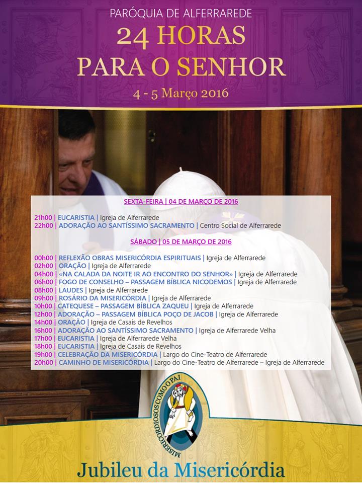 A paróquia de Alferrarede, aceitando o desafio do Papa Francisco, celebrou as "24h para o Senhor", uma corrente de oração que durou desde as 21h do dia 4 março até às 21h do dia 5 de março. A JMV de Alferrarede participou nesta corrente, dando a sua parte quer na dinamização de momentos de oração, quer na participação ativa em momentos organizados por outros movimentos da paróquia.